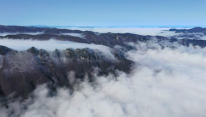湖南省郴州市宜章縣莽山五指峰景區(qū)因?yàn)槔渑諝庠诖私粎R,形成了逆溫層,山上陽光明媚,氣溫高,山下氣溫低,或陰雨綿綿、或結(jié)冰成型,中間是云海。
