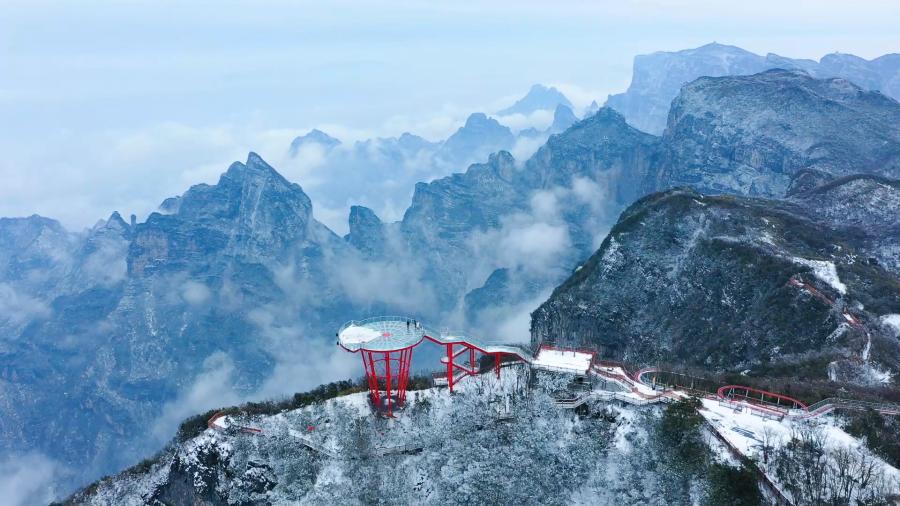 1月6日,湖南省張家界市迎來新年第一場(chǎng)雪。在海拔1500多米的天門山上大雪紛飛,讓雄奇的群峰披上了銀裝。遠(yuǎn)處的云氣纏繞在墨色的群山間,近處的樹枝被霧凇染白了頭。行走在這如水墨畫般的風(fēng)景中,宛若置身仙境。(蘇崢嶸 覃少波 邵穎 丁文國)